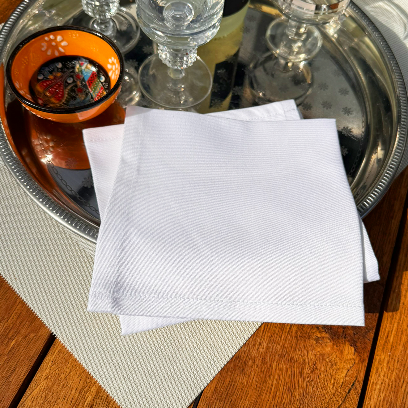 We offer you 100pc exclusive white fabric cocktail napkins. These elegant napkins without pattern measure 30x30 cm and have a folded size of 15x15 cm, making them very small – ideal for finger food, small snacks, or tasty appetizers that can be taken by hand and enjoyed.