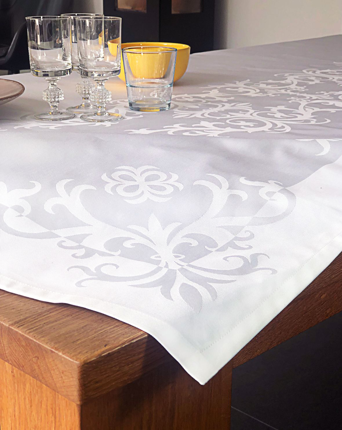 With a size of 140x360cm, this damask tablecloth is made for a very large table, ideally with a tabletop size of approx. 100x320cm.